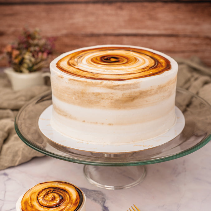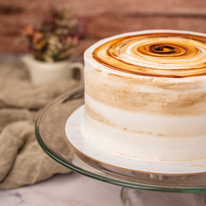4 capas de bizcocho: 2 de chocolate y 2 de vainilla remojadas con licor de Amaretto y entreteladas con crema chantillí, cubierto con crema.