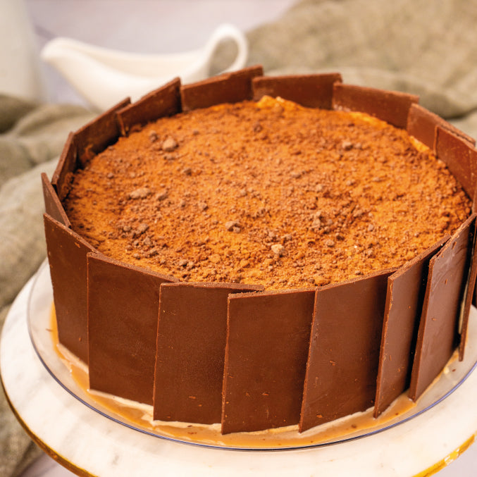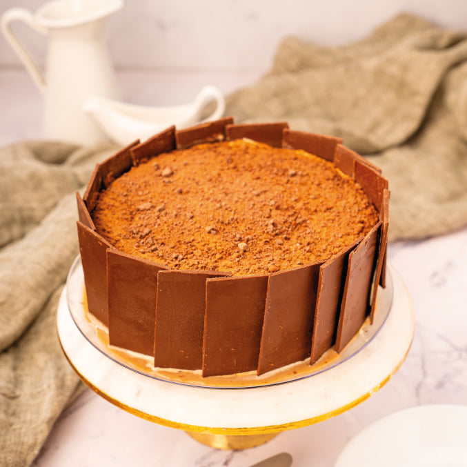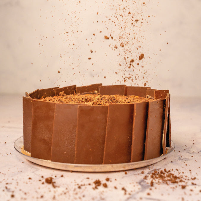 Bizcocho esponjoso, bañado en salsa Tres leches de chocolate. Va decorado con placas lisas de chocolate oscuro por los lados y lluvia de Milo por encima.